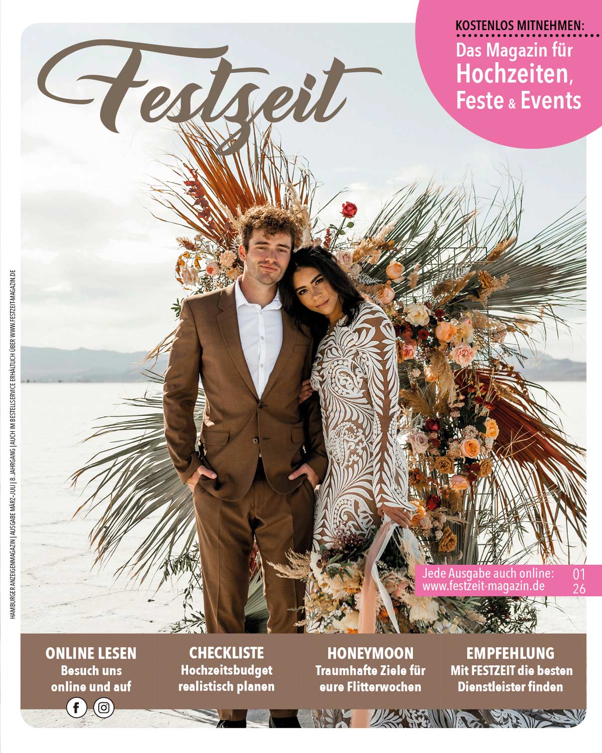 Spezialisiert auf das Segment Hochzeiten, Feste und Events. Das Magazin richtet sich an alle, die ein großes Event planen, von der Konfirmation, über den runden Geburtstag bis hin zur Hochzeit und sonstigen Festen! Prall gefüllt mit Themen wie Mode, Lifestyle, Geschenketipps, Accessoires, Gewinnspiele, Reisen, Beauty, redaktionelle Berichte und TIpps zum Thema Feiern, Ehe, Freundschaft und mehr. Lesen können Sie Festzeit online. Außerdem liegt die Printausgabe an ca 300 Verteilungsstellen für Sie in Hamburg und dem Umland bereit.